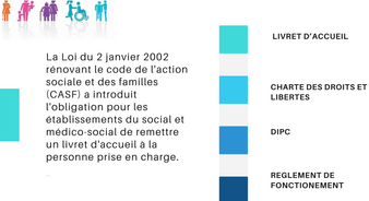La Loi du 2 janvier 2002 rénovant le code de l'action sociale et des familles (CASF) a introduit l'obligation pour les établissements du social et médico-social de remettre un livret d'accueil à la personne prise en charge.